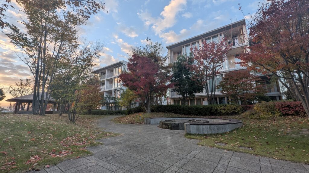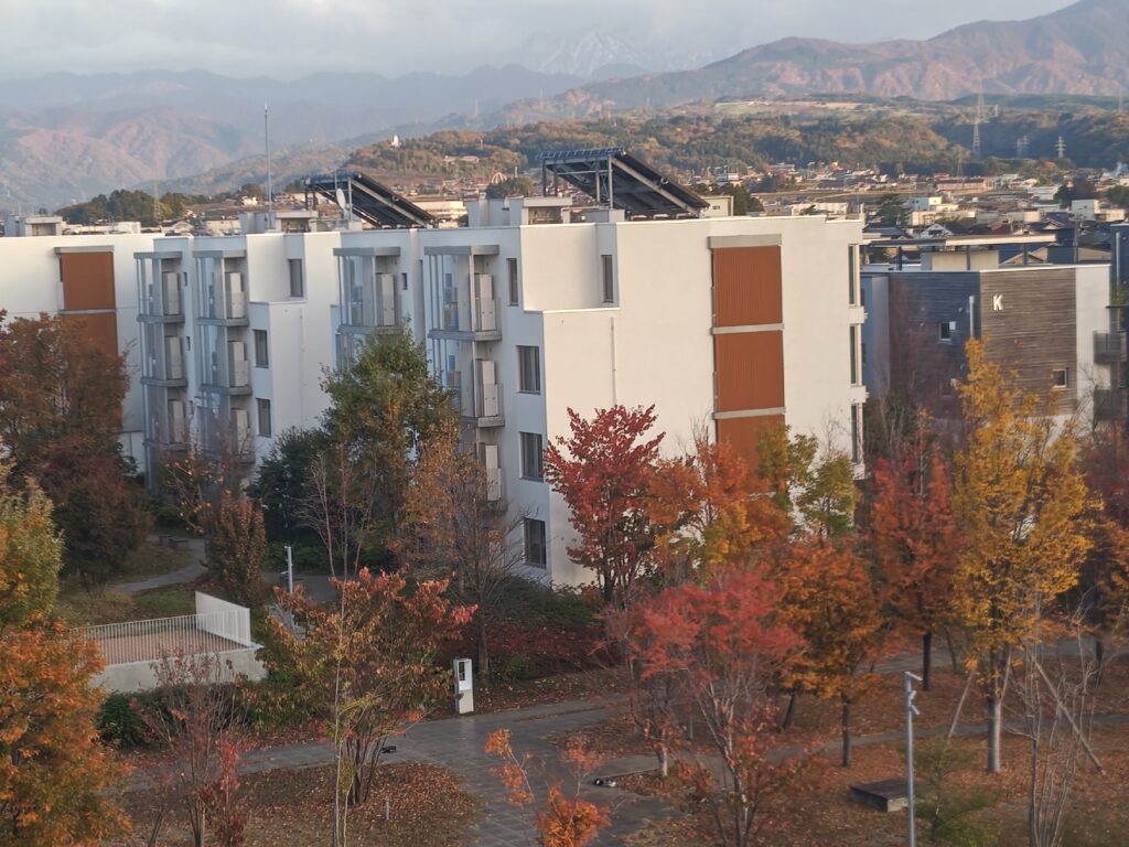 連続した水平ラインが際立ち、外壁の無垢板と朱色が伝統木造建築のような風合いがあります。11月の紅葉と相まって立山連峰と建物の情緒のある景色を作り出していました。