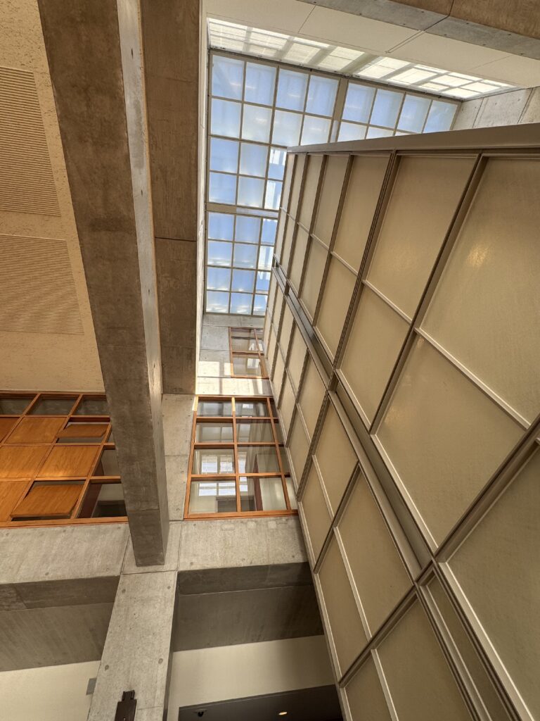 建物中心の階段を包むカーテンウォールと、やわらかな光を落とす天窓