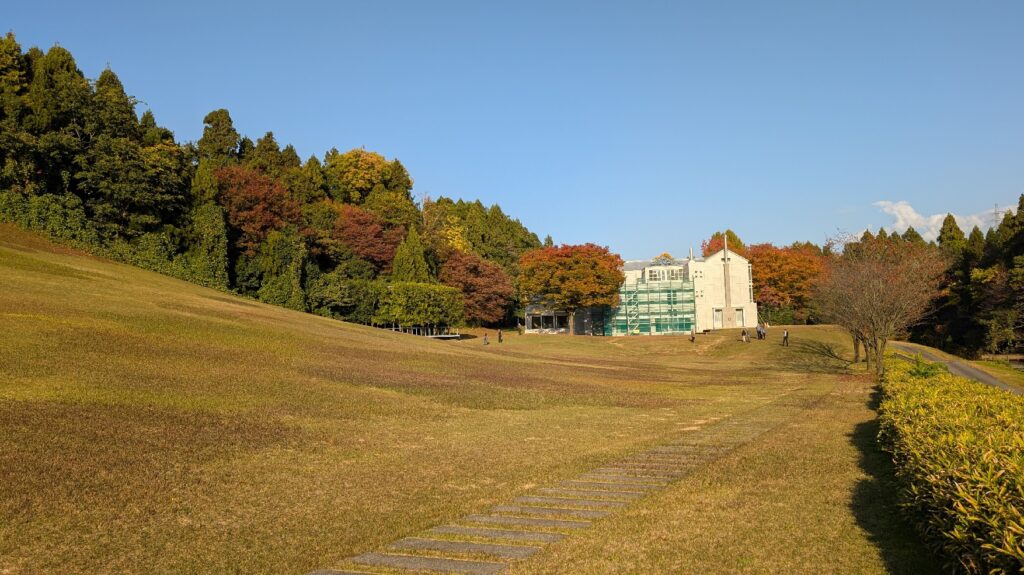 ガーデンからみた外観。左側の木は竣工当時に植えられたそうです。立派に成長しています。